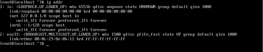 ip addr查看当前网卡的配置信息,当前系统的 ens33 网卡并没有 ipv4 及 ipv6, 没有 ip地址 则只能说明一个问题,当前 linux 系统是没有办法上网的,lo 这块网卡每一个系统中都会有, 这个称之为回环网卡。