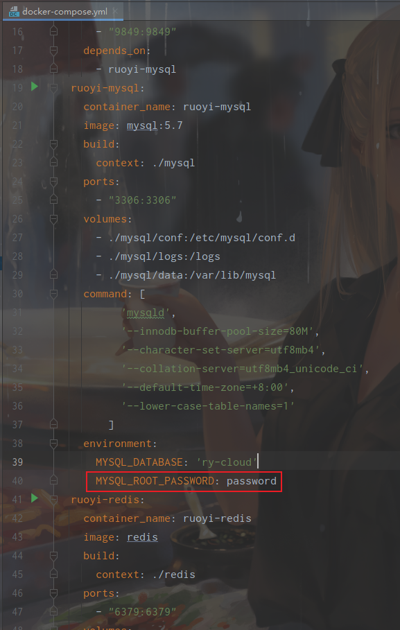 主要将redis和mysql 的地址修改为容器的名,也就是ruoyi-redis和ruoyi-mysql。
